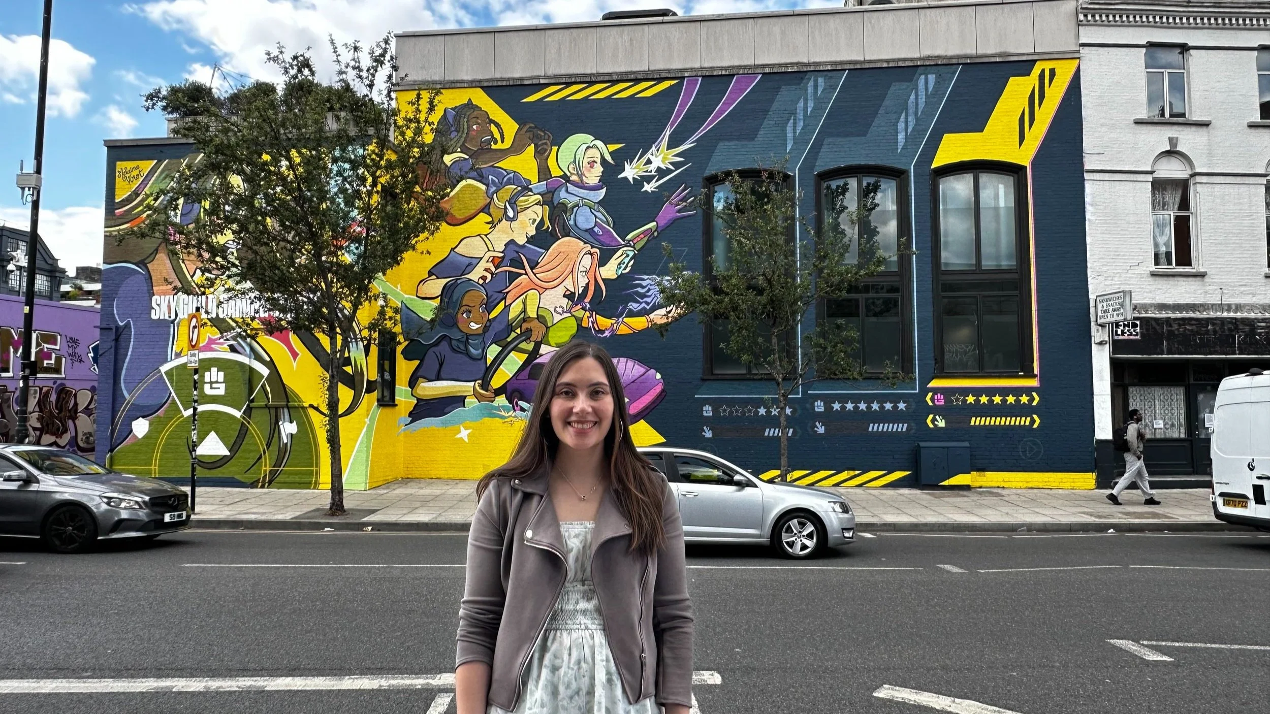 Mélaine visiting her mural at the Sky Guild Gaming Centre in Shoreditch, London